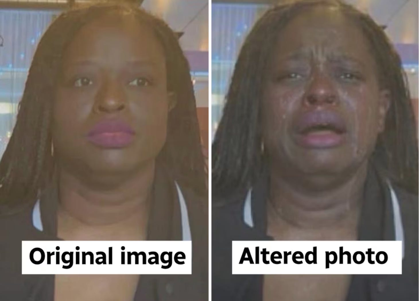 And the photo manipulation matters deeply. Because while the son is being rendered angelic through narrative, a Black woman is being rendered more criminal through pixels. Her image is being adjusted to heighten threat. Her humanity is flattened. Her vulnerability is being erased. And her body is being turned into a visual argument for force. That is the split screen of American white supremacy in its most honest form: one body elevated into myth, another distorted into justification.