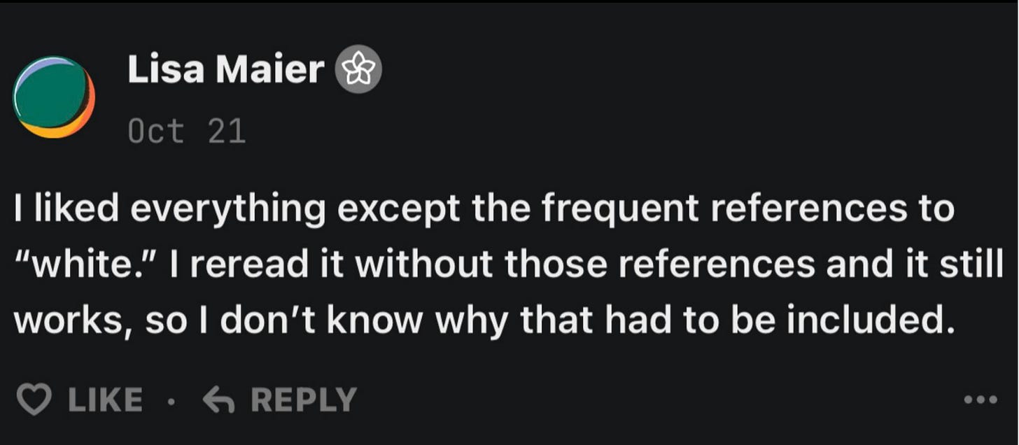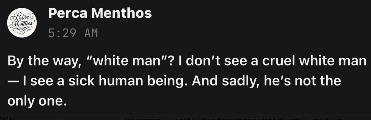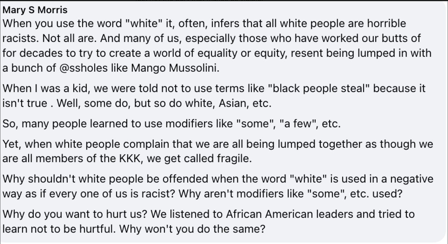 And then came the pièce de résistance from Mary, who delivered a whole White Woman Soliloquy. It had everything, y’all. It had the moral résumé. The false equivalence. The plea for fairness. And a touch of emotional blackmail for flavor. She wanted me to know she’s one of the good ones. She is the kind of white woman who’s worked her “butt off for decades” to create a better world. She compared my use of white people to saying Black people steal, as if naming systemic power is the same as parroting a racial stereotype. She insisted on the importance of using modifiers like some, a few instead of being lumped in with the KKK.