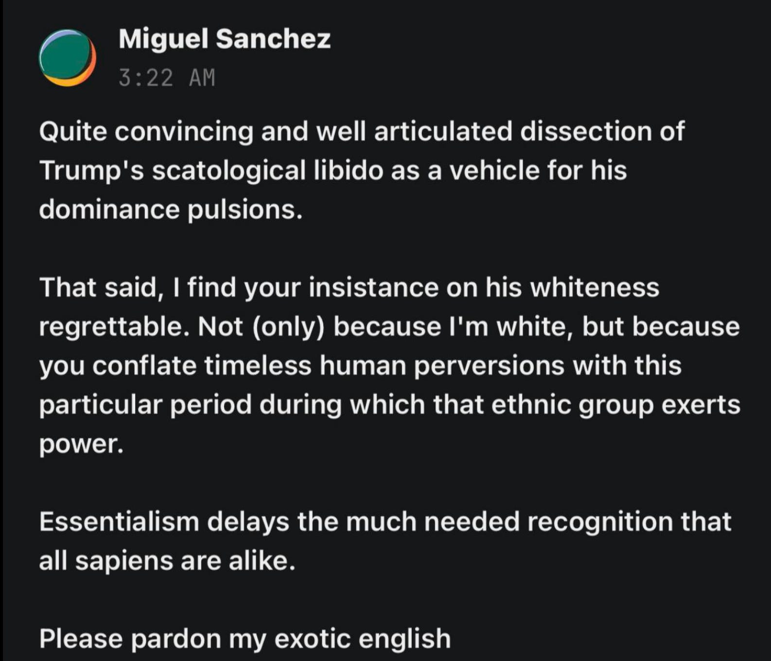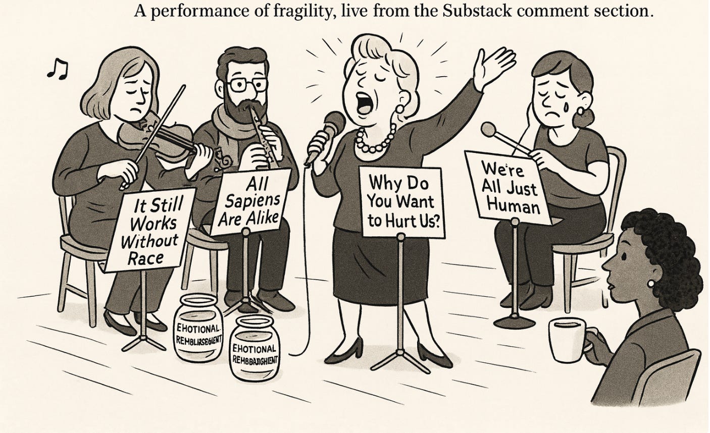 Then came Miguel, trying to intellectualize the discomfort. He wrapped it in pseudo-philosophy by calling my framing “essentialist” and reminding me that “all sapiens are alike.” Which is exactly what whiteness says when it wants to stay unexamined. That’s the philosophical version of all lives matter. What he’s really saying is, “please don’t racialize me.” It’s the soft power move of somebody who is desperately trying to retreat into universalism where whiteness can dissolve back into “humanity” and avoid accountability. Miguel even tossed in a departing humblebrag about his “exotic English” as a way of masking a passive aggressive attempt to lecture me back into color-blind civility. Substack commenters like him won’t always outright call a Black woman writer angry, they’re more elegant with their shade and policing.