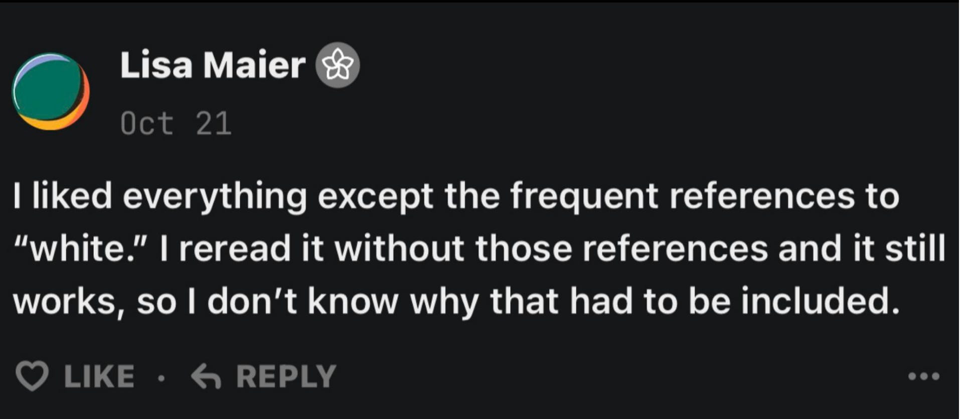 Lisa was the first to flinch. “I reread it without those references,” she said, “and it still works.” So, in other words, the ideal version of my essay is one where whiteness remains invisible and she can enjoy the moral insight without the mirror. For her, race is fine as long as it’s ornamental, not structural. The moment I made whiteness visible, it stopped being literature and started feeling like a liability.