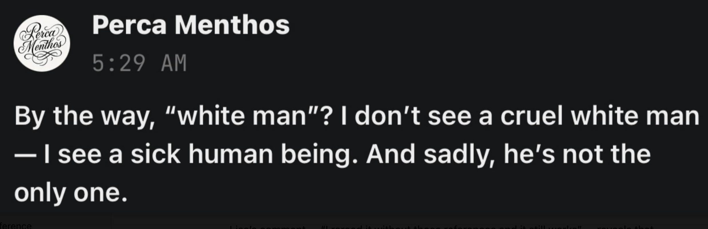 And then there was Perca, who came bearing moral sanitizer. “I don’t see a cruel white man; I see a sick human being,” she wrote, as if empathy could scrub the word white clean. Perca wanted to preserve goodness, not truth, to frame Trump’s grotesque behavior as a symptom, not a statement. Because if it’s sickness, it can be personal. But if it’s whiteness, it’s cultural. And that, apparently, is a bridge too far for Perca.